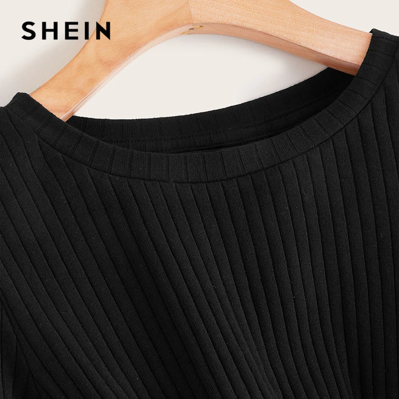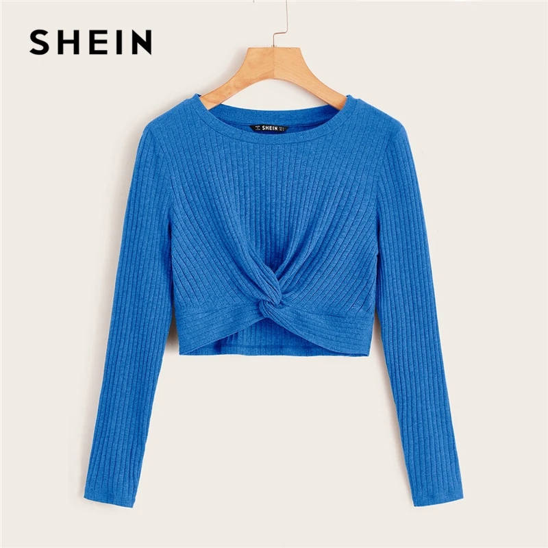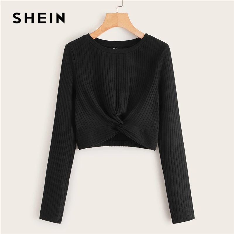 discount SHEIN Solid Twist Front Rib-knit Crop Top Fitted T Shirt Women Autumn Winter Long Sleeve Round Neck